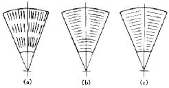 箅板孔的排列方式很多,常用的是同心圓排列和輻射狀排列。同心圓排列(圖 1-17(b))的孔是平行于物料和研磨體的運(yùn)動軌跡。因此,對物料的通過阻力小,通過量較多,且不易堵塞,但過去的物料容易返回,而輻射狀箅孔(圖1-17(a))與此相反。對于雙層球磨機(jī)隔倉板上的箅板由于不存在物料返回問題,從而消除了同心圓排列的缺點(diǎn),而保留其優(yōu)點(diǎn)。因此,雙層隔倉板的箅孔通常都是同心圓排列的。為便于制造,同心圓排列常以其近似形狀代替,形成多邊形排列,如圖1-17(c)所示。輻射狀箅板對研磨體有牽制作用,使靠近箅板附近的研磨體有較大的提升高度,于是在空腔中出現(xiàn)了球面的高差,因而使集聚于球載輪廓中部為數(shù)較多的大研磨體優(yōu)先移向隔倉板,同時(shí)將小研磨體陸續(xù)排擠到另一端。所以,卸料箅板不宜采用輻射狀箅孔。