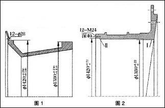 以Φ4000×1400濕式自磨機(jī)為例。濕式自磨機(jī)進(jìn)料部由進(jìn)料襯套和中空軸組成,它們的結(jié)構(gòu)分別如圖1和圖2所示,該結(jié)構(gòu)有兩個(gè)配合面,為Φ1380面和Φ1420面,進(jìn)料襯套上的兩個(gè)配合面公差均為-0.410~-0.190,中空軸上的兩個(gè)配合面公差為0~+0.220,兩個(gè)相對(duì)應(yīng)的配合面之間所形成的配合間隙大為0.63,小為0.19,中空軸前端有12個(gè)周布的、深度為40的M24內(nèi)螺紋孔,與進(jìn)料襯套上的12個(gè)Φ28孔相對(duì)應(yīng),中空軸和進(jìn)料襯套之間就用這12根M24 的螺桿進(jìn)行聯(lián)接,進(jìn)料襯套以這l2根螺桿進(jìn)行軸向固定,依靠?jī)蓚€(gè)配合臺(tái)面進(jìn)行徑向固定,進(jìn)料襯套的運(yùn)動(dòng)則通過這l2根螺桿來傳遞。